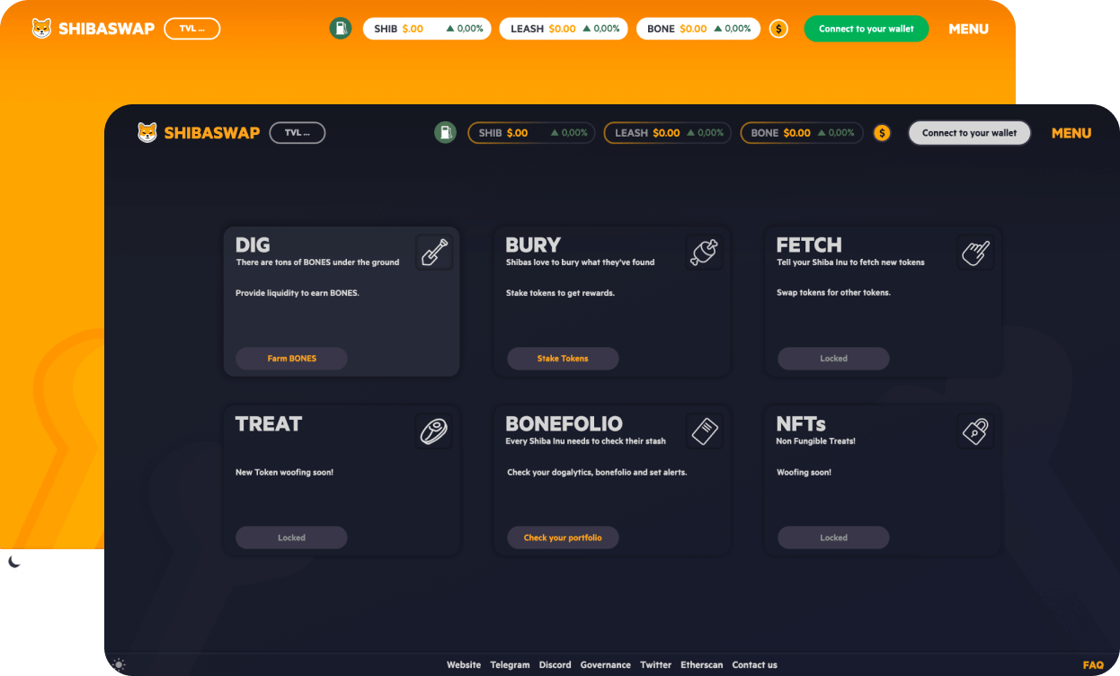 SHIB, LEASH, and BONE, come together to create ShibaSwap, the next evolution in DeFi platforms. ShibaSwap gives users the ability to DIG (provide liquidity), BURY (stake), and SWAP tokens to gain WOOF Returns through our sophisticated and innovative passive income reward system.